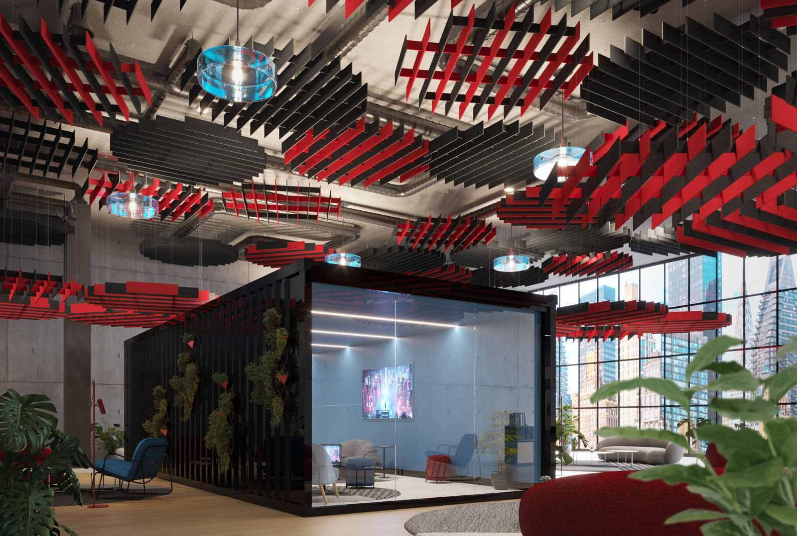 These round-style acoustic ceiling baffles are crafted from 100% natural wool felt and arranged in a gently curved, layered grid that creates a striking floating ceiling feature. The radial layout softens the geometry of the space while effectively diffusing and absorbing sound from multiple directions, helping to reduce echo and enhance acoustic comfort.