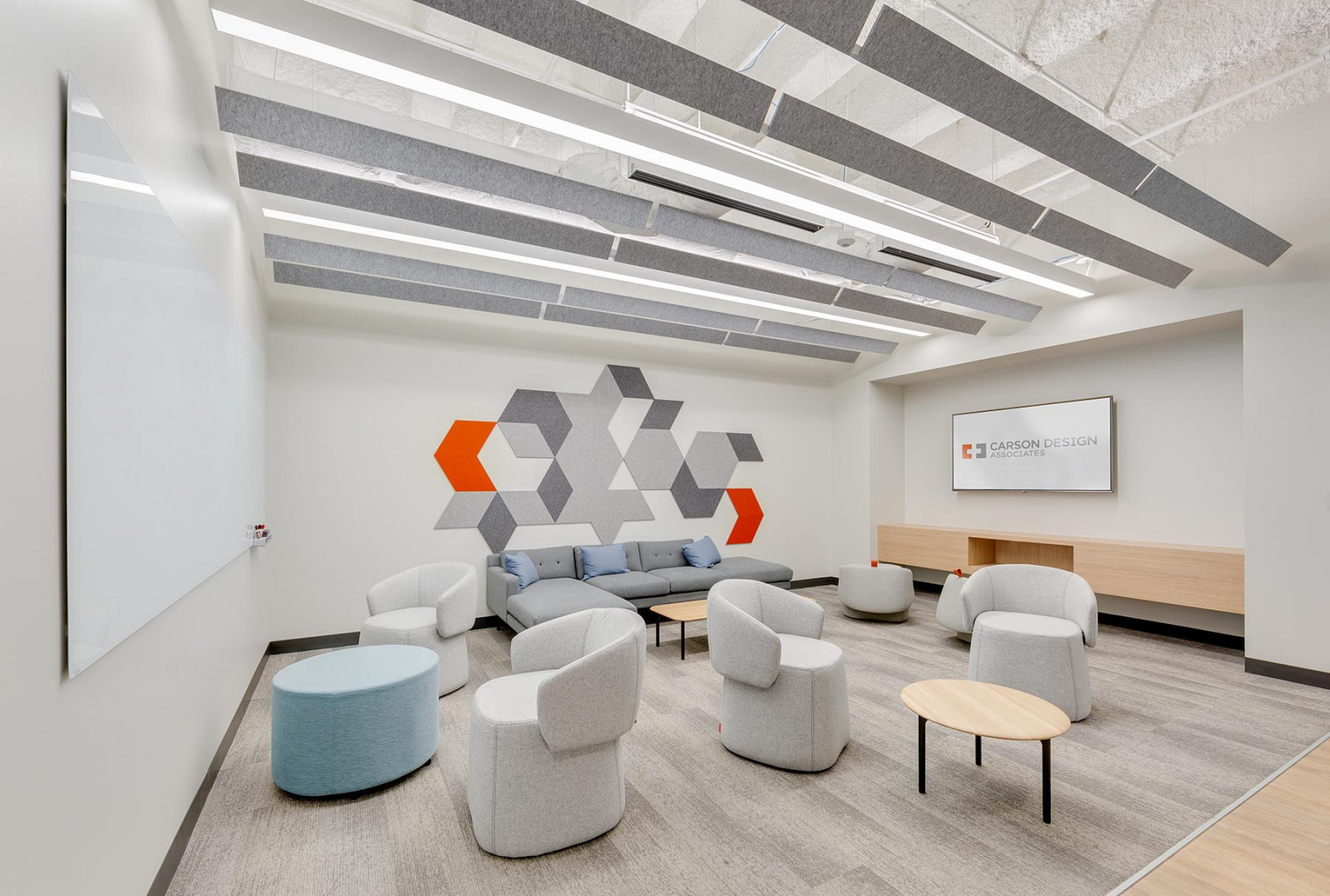 This ceiling baffle system is a striking acoustic solution crafted from Eco felt, designed to bring both performance and visual depth to interior spaces. Suspended vertically from the ceiling, the baffles are arranged in a rhythmic sequence of angled panels that create a dynamic, sculptural presence while maintaining a clean and modern aesthetic.