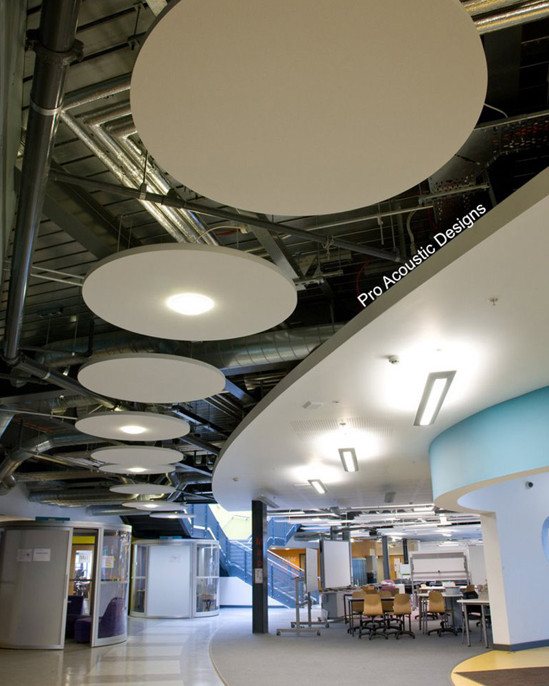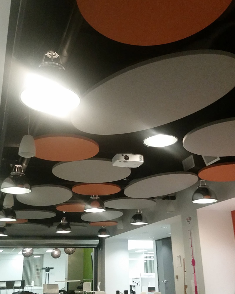 Acoustic Fabric Wrapped Ceiling Clouds provide the perfect solution to address sound and echo absorption needs within interior spaces. By effectively softening sound and reducing speech reflections, these clouds significantly enhance acoustical performance while simultaneously elevating the visual appeal and design of the surroundings. Made from a VOC Free Fiberglass, the acoustical fabric ensures convenient stain resistance, durability, and easy maintenance.